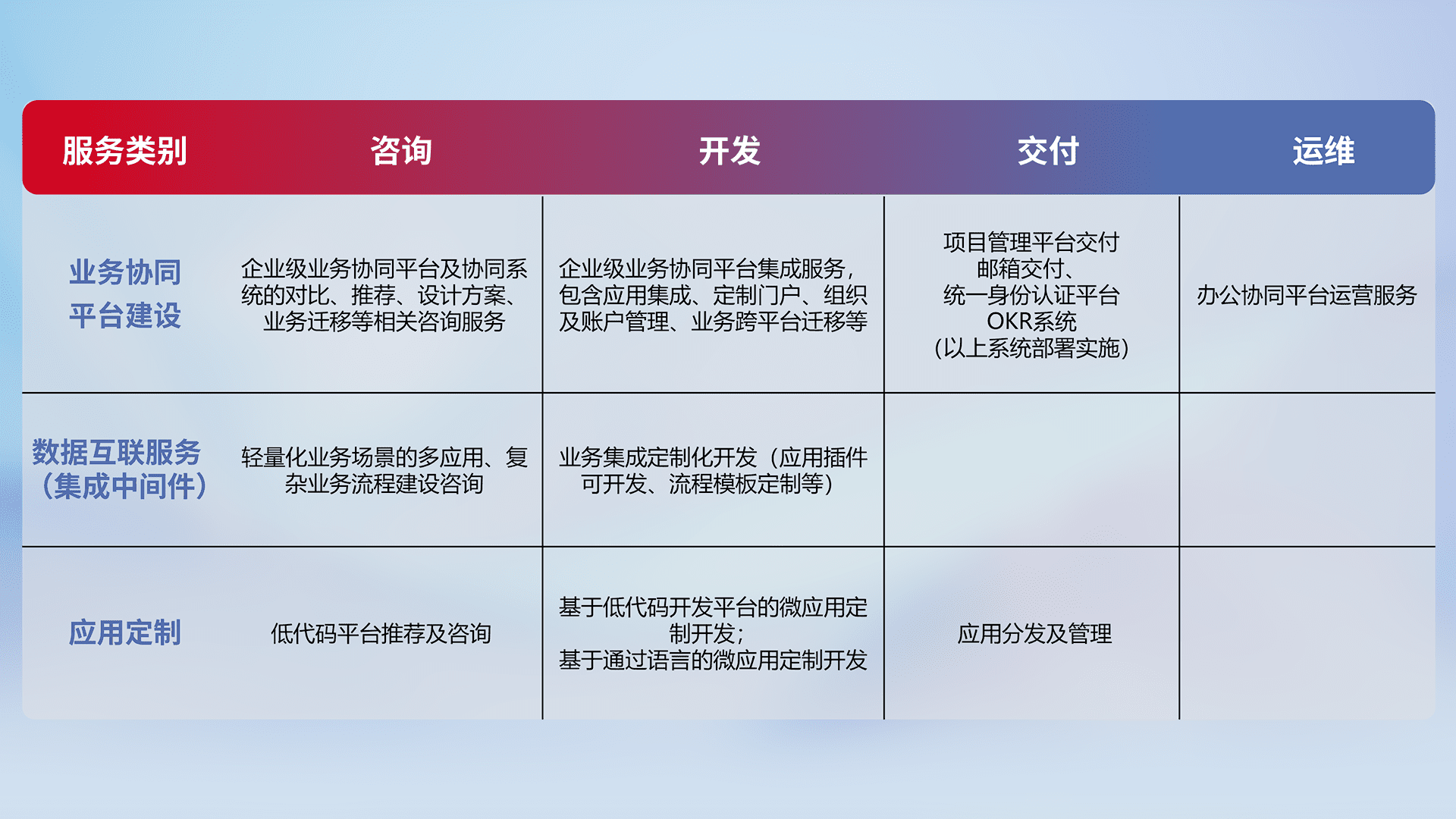针对钉钉、、企微、、、、IDaas等平台级产品提供产品的规划、、方案、、、、交付、、、定制化开发等服务,,实现如统一协同办公、、、智能客户服务、、、、混合会议管理、、、智能数据查询、、、、等业务场景,,实现数字化转型。。。。